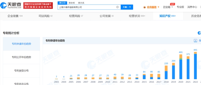 天眼查顯示,近三年,外高橋造船專(zhuān)利申請(qǐng)數(shù)量猛增,2020年為401件,2021年371件,2022年達(dá)到441件。這其中有不少專(zhuān)利涉及到大型郵輪,例如“大型郵輪反彈式水封地漏”“大型郵輪醫(yī)院抽風(fēng)管過(guò)濾裝置”等。
