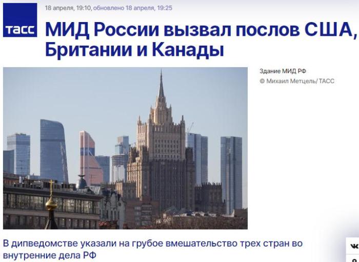 據(jù)報(bào)道,俄外交部表示,“由于粗暴干涉俄羅斯內(nèi)部事務(wù)和從事不符合外交地位的活動(dòng),美國(guó)、英國(guó)和加拿大的大使被俄外交部召見(jiàn)。”