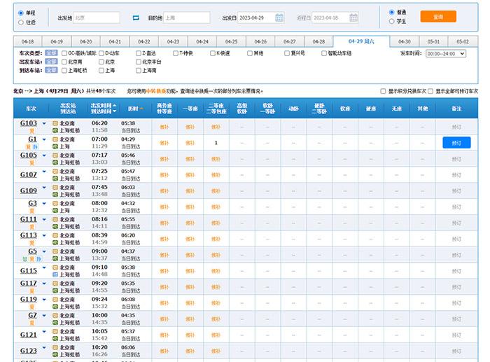 中新財經18日登錄12306官網查詢發(fā)現,4月29日由北京出發(fā)到上海、武漢、南京、西安的旅客列車車票已基本售罄,上述線路4月30日車票也所剩無幾。