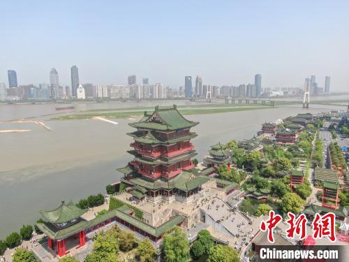 圖為2021年5月2日, 位于江西南昌贛江之畔的江南名樓滕王閣迎來(lái)眾多游客。(無(wú)人機(jī)照片) 中新社記者 劉占昆 攝