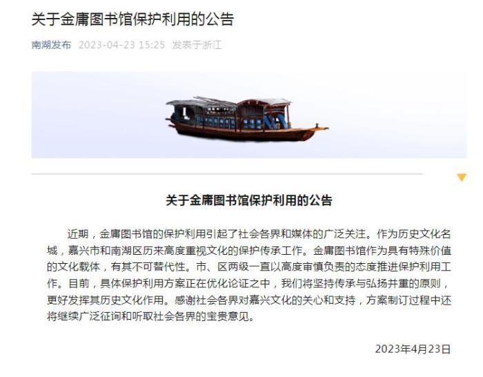 中新網(wǎng)4月23日電 近期,金庸圖書館的保護利用引發(fā)關注。浙江省嘉興市南湖區(qū)人民政府今日通過微信公眾號發(fā)布公告稱,作為歷史文化名城,嘉興市和南湖區(qū)歷來高度重視文化的保護傳承工作。金庸圖書館作為具有特殊價值的文化載體,有其不可替代性。市、區(qū)兩級一直以高度審慎負責的態(tài)度推進保護利用工作。目前,具體保護利用方案正在優(yōu)化論證之中,南湖區(qū)將堅持傳承與弘揚并重的原則,更好發(fā)揮其歷史文化作用。感謝社會各界對嘉興文化的關心和支持,方案制訂過程中還將繼續(xù)廣泛征詢和聽取社會各界的寶貴意見。