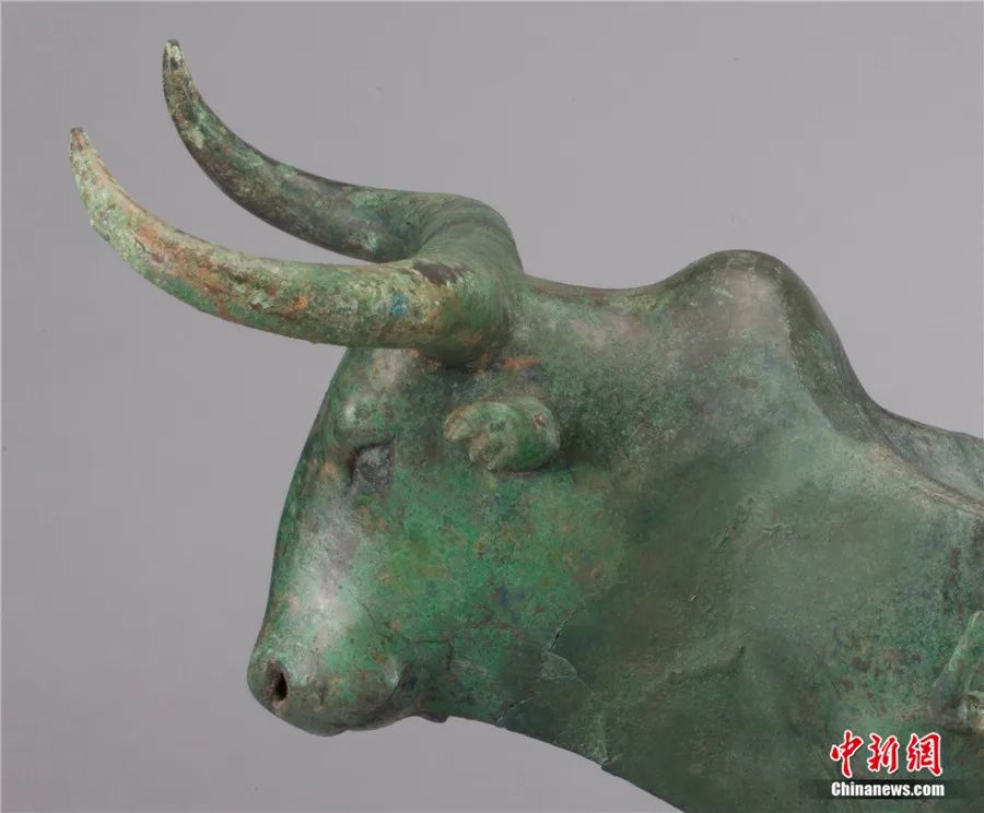 ?;~案的器物主體是一頭封牛,其特點在于兩邊牛角向內(nèi)彎曲,牛角尖向上翹起,牛脖子上有一個隆起部分,像駱駝的駝峰。封牛曾是亞洲的主要牛種之一,云南地區(qū)的封牛則通過有著“南方絲綢之路”之稱的蜀身毒道,從印度至緬甸,后進(jìn)入云南。這條交通要道促進(jìn)了滇國與其他文明在商貿(mào)、文化上的交流融合。