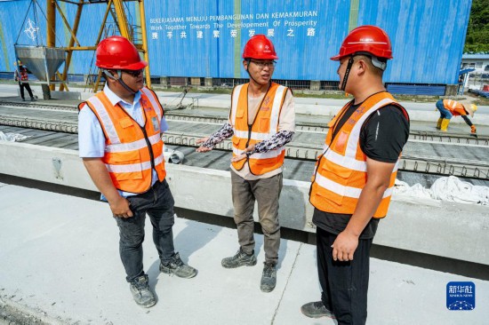 4月26日,在馬來西亞吉蘭丹州的馬東鐵項(xiàng)目一分部制梁場(chǎng),技術(shù)主管鄧友志(右)和馬來西亞本地青年員工鄧德緯討論生產(chǎn)情況。五月初的馬來西亞烈日炎炎,中馬共建“一帶一路”的標(biāo)志性項(xiàng)目——馬來西亞東海岸鐵路(馬東鐵)建設(shè)如火如荼。十支由中馬兩國(guó)員工組成的青年突擊隊(duì)活躍在全長(zhǎng)600多公里的馬東鐵沿線建設(shè)現(xiàn)場(chǎng),用汗水和擔(dān)當(dāng)抒寫屬于這個(gè)時(shí)代的青春篇章。新華社記者 朱煒 攝