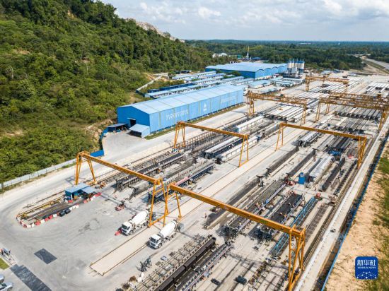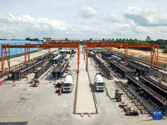 這是4月26日在馬來西亞吉蘭丹州拍攝的馬東鐵項(xiàng)目一分部制梁場(chǎng)(無人機(jī)拍攝)。新華社記者 朱煒 攝