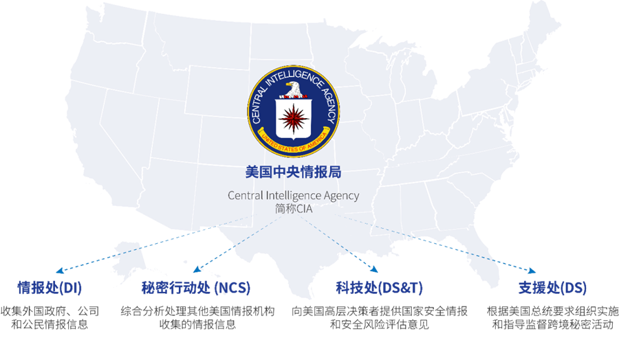 CIA是美國(guó)聯(lián)邦政府主要情報(bào)機(jī)構(gòu)之一,總部位于美國(guó)弗吉尼亞州蘭利,下設(shè)情報(bào)處(DI)、秘密行動(dòng)處(NCS)、科技處(DS&T)、支援處(DS)四個(gè)部門。其主要業(yè)務(wù)范圍涉及:收集外國(guó)政府、公司和公民情報(bào)信息;綜合分析處理其他美國(guó)情報(bào)機(jī)構(gòu)收集的情報(bào)信息;向美國(guó)高層決策者提供國(guó)家安全情報(bào)和安全風(fēng)險(xiǎn)評(píng)估意見;根據(jù)美國(guó)總統(tǒng)要求組織實(shí)施和指導(dǎo)監(jiān)督跨境秘密活動(dòng)等。