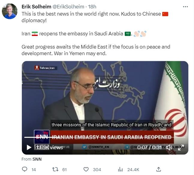索爾海姆配文提到“伊朗重新開放駐沙特阿拉伯大使館”。他表示,“這是目前世界上最好的消息。為中國(guó)外交點(diǎn)贊!”
