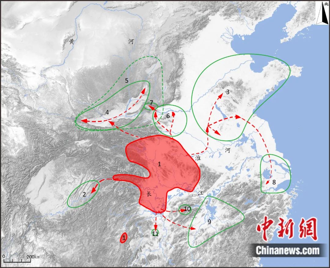 屈家?guī)X文化對外擴(kuò)張路線示意圖(紅色區(qū)域?yàn)榍規(guī)X文化主要分布范圍)。受訪者 供圖