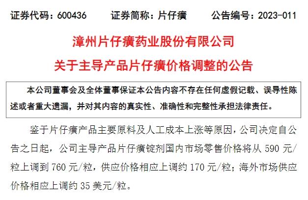 此番漲價(jià)的消息源于片仔癀5日發(fā)布的一則公告,其中提到,公司決定自公告之日起,主導(dǎo)產(chǎn)品片仔癀錠劑國(guó)內(nèi)市場(chǎng)零售價(jià)格將從590元/粒上調(diào)到760元/粒,供應(yīng)價(jià)格相應(yīng)上調(diào)約170元/粒;海外市場(chǎng)供應(yīng)價(jià)格相應(yīng)上調(diào)約35美元/粒。