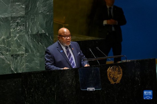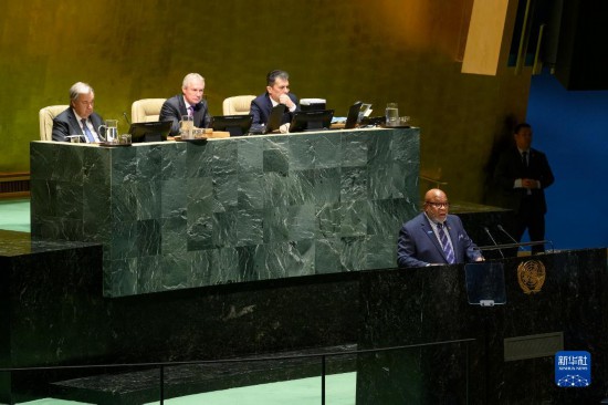 6月1日,在位于紐約的聯合國總部,特立尼達和多巴哥常駐聯合國代表丹尼斯·弗朗西斯(前)當選第78屆聯合國大會主席后發(fā)表講話。新華社發(fā)(聯合國供圖/洛伊·費利普攝)