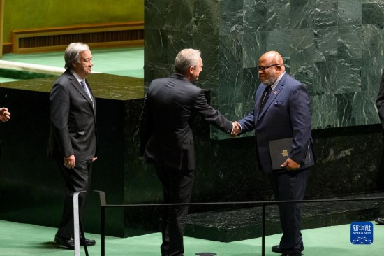 6月1日,在位于紐約的聯合國總部,特立尼達和多巴哥常駐聯合國代表丹尼斯·弗朗西斯(右)當選第78屆聯合國大會主席后與第77屆聯大主席克勒希握手。新華社發(fā)(聯合國供圖/洛伊·費利普攝)