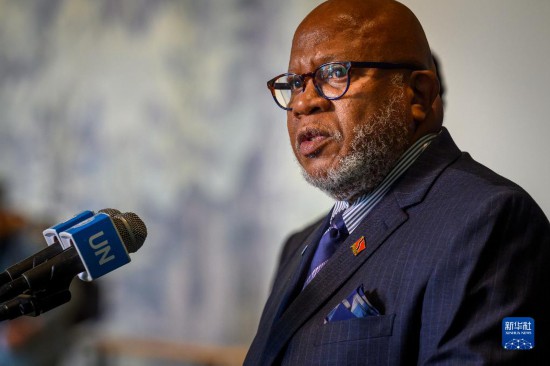 6月1日,在位于紐約的聯合國總部,特立尼達和多巴哥常駐聯合國代表丹尼斯·弗朗西斯當選第78屆聯合國大會主席后向記者發(fā)表談話。新華社發(fā)(聯合國供圖/洛伊·費利普攝)
