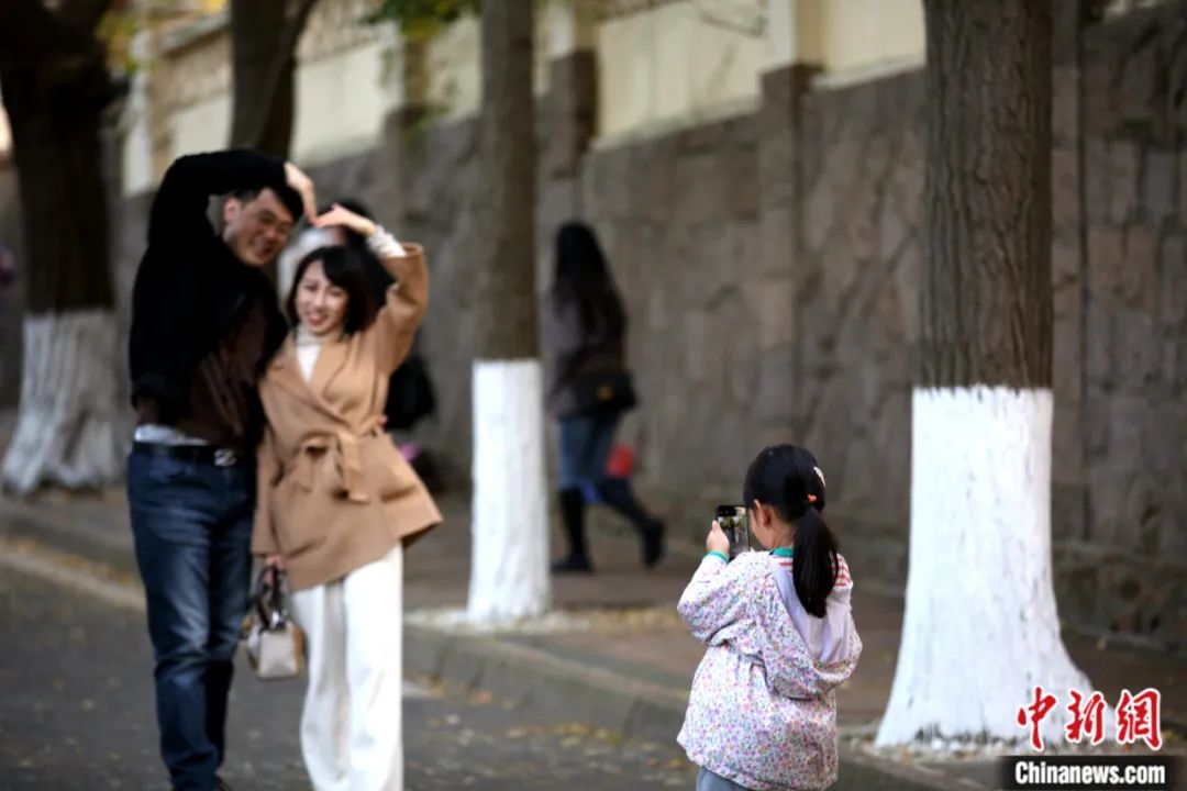 2022年11月,山東省青島市八大關景區(qū)居庸關路,一名兒童為父母拍照留念。蔡亞群 攝