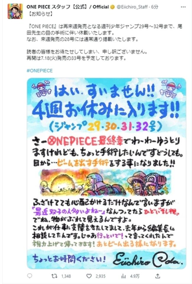 其官網還發(fā)布了尾田榮一郎在自己的手繪插畫上寫的“請假條”。他表示:“非常抱歉,我將休息四周時間?!逗胶M酢冯m然已經進入終章,但由于眼睛的散光很嚴重,看東西時出現(xiàn)重影,所以需要做個手術。請給我一些時間(修養(yǎng)一下)。”