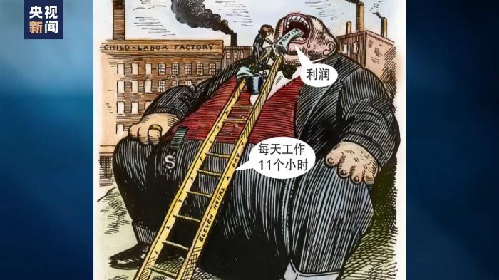 在這張漫畫(huà)中,一名瘦削的童工一天工作11個(gè)小時(shí),將利潤(rùn)送進(jìn)貪婪的雇主口中,將他們養(yǎng)得腦滿(mǎn)腸肥。