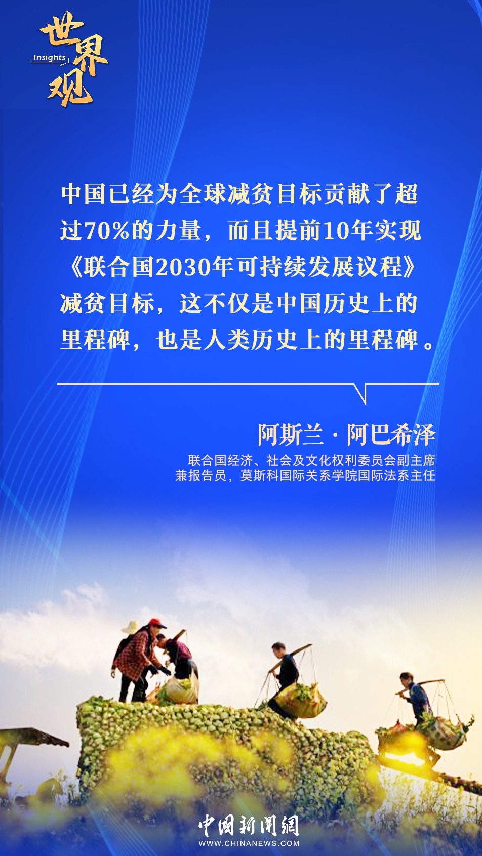 聯(lián)合國經(jīng)濟(jì)、社會(huì)及文化權(quán)利委員會(huì)副主席兼報(bào)告員,莫斯科國際關(guān)系學(xué)院國際法系主任阿斯蘭·阿巴希澤高度評(píng)價(jià)中國減貧成就,稱其樹立了新的歷史豐碑。