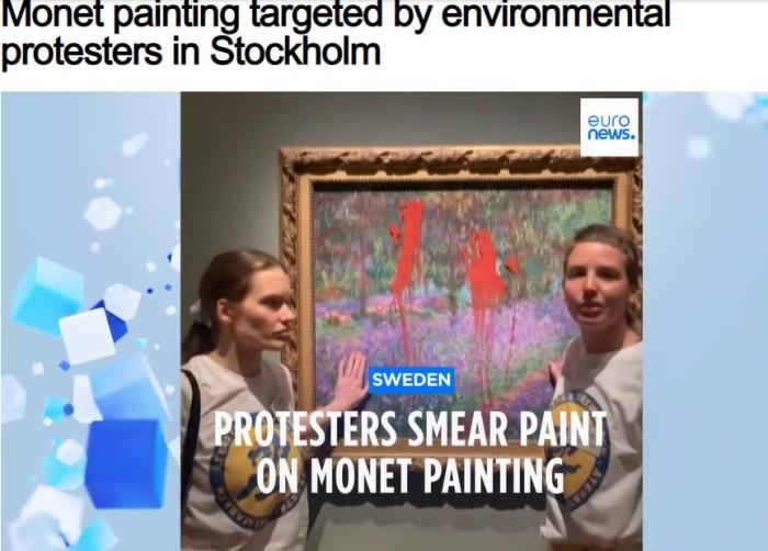 據(jù)法新社報道,這兩名女性環(huán)保主義者屬于瑞典本土組織“Restore Wetlands(恢復(fù)濕地)”,她們在畫作表面的保護玻璃上涂紅漆,并在手上涂膠水把手粘在玻璃上。這兩人為護士和實習(xí)護士。Restore Wetlands在臉書頁面上發(fā)布了現(xiàn)場視頻。