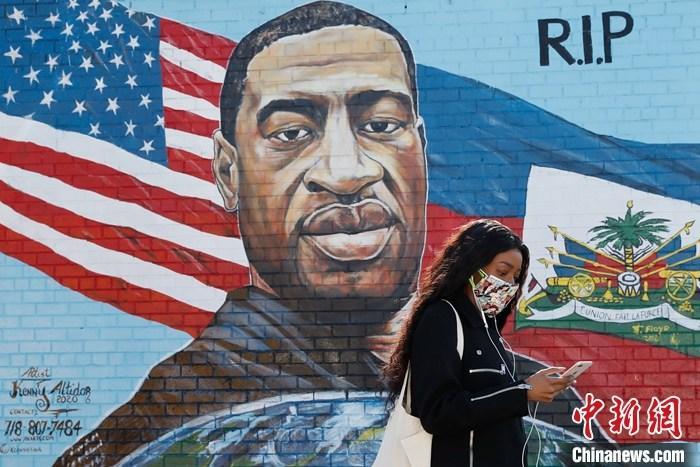 資料圖:美國(guó)紐約布魯克林區(qū)一位市民走過(guò)弗洛伊德畫(huà)像。 中新社記者 廖攀 攝