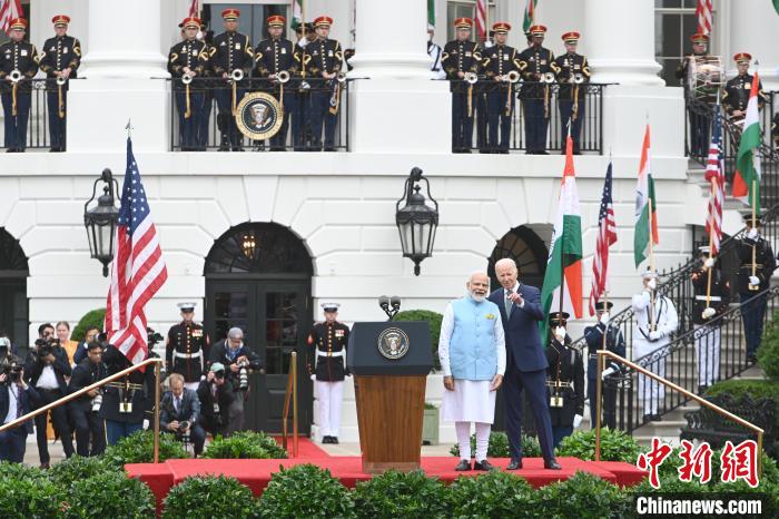 當?shù)貢r間6月22日,印度總理莫迪對美進行國事訪問。圖為美國總統(tǒng)拜登與莫迪出席白宮歡迎儀式。中新社記者 陳孟統(tǒng) 攝