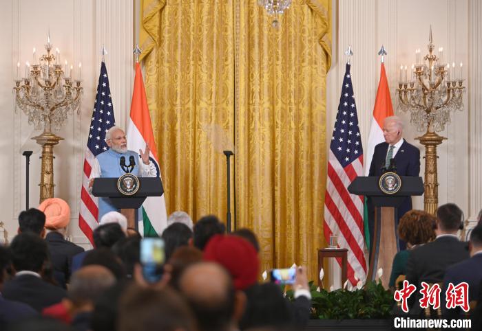 當?shù)貢r間6月22日,印度總理莫迪對美進行國事訪問。圖為美國總統(tǒng)拜登與莫迪在白宮出席聯(lián)合記者會。中新社記者 陳孟統(tǒng) 攝