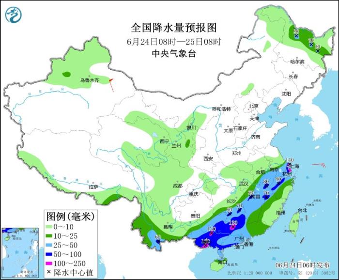 全國(guó)降水量預(yù)報(bào)圖(6月24日08時(shí)-25日08時(shí))
