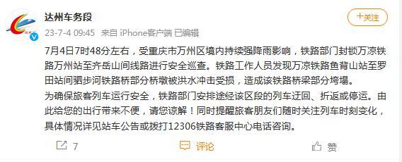 中新網(wǎng)7月4日電 據(jù)成都鐵路局達(dá)州車務(wù)段官方微博消息,7月4日7時(shí)48分左右,受重慶市萬(wàn)州區(qū)境內(nèi)持續(xù)強(qiáng)降雨影響,鐵路部門封鎖萬(wàn)涼鐵路萬(wàn)州站至齊岳山間線路進(jìn)行安全巡查。鐵路工作人員發(fā)現(xiàn)萬(wàn)涼鐵路魚背山站至羅田站間駟步河鐵路橋部分橋墩被洪水沖擊受損,造成該鐵路橋梁部分垮塌。為確保旅客列車運(yùn)行安全,鐵路部門安排途經(jīng)該區(qū)段的列車迂回、折返或停運(yùn)。