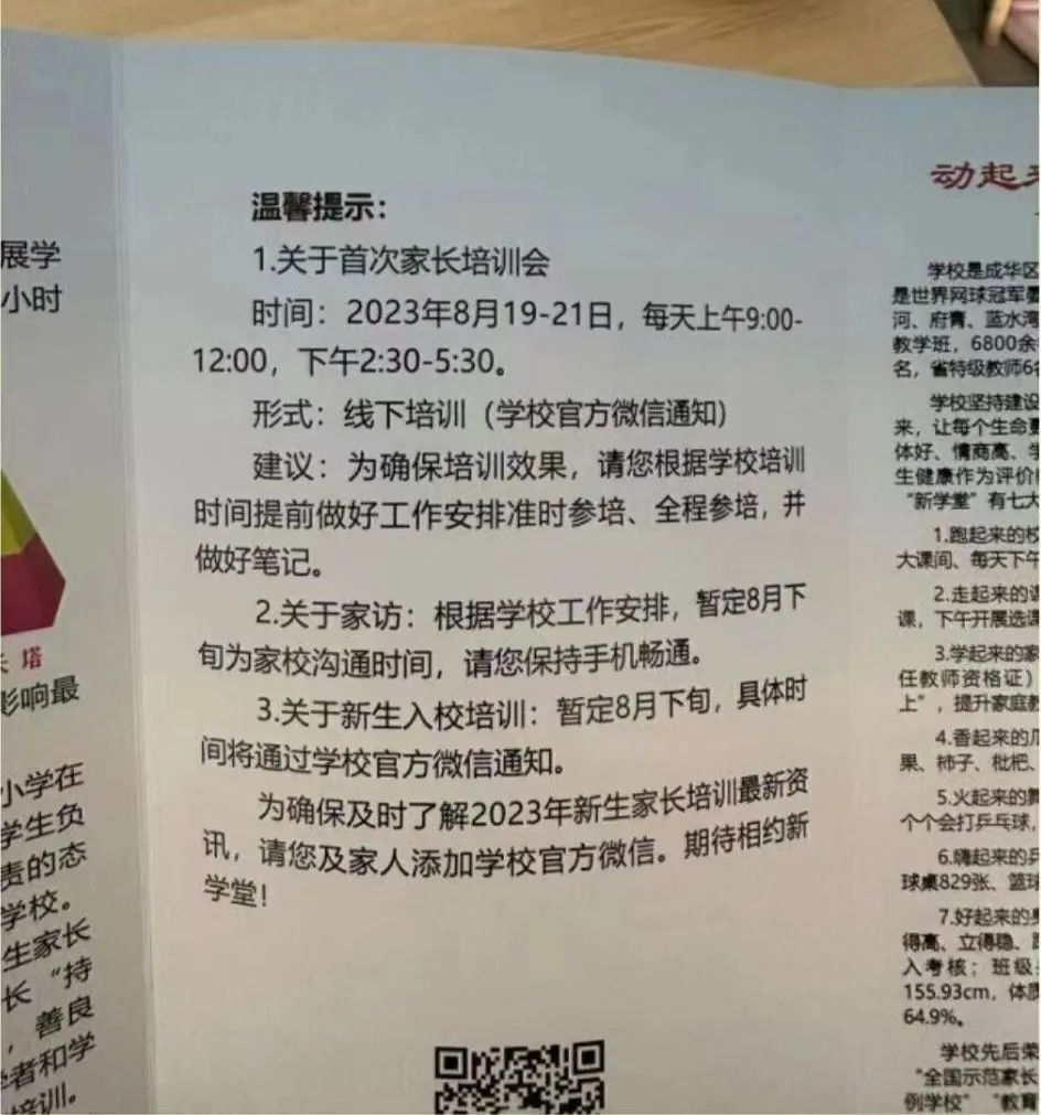 這則通知書是發(fā)給成都某小學(xué)2023級(jí)新生家長的,包含了寫給家長的一封信、學(xué)校簡介、學(xué)校的教育理想等內(nèi)容,其中,引發(fā)家長們熱議的,是在通知書的溫馨提示部分,家長們被告知:學(xué)校將在8月19日到21日舉行首次家長培訓(xùn)會(huì),形式為線下,時(shí)間為三個(gè)全天。