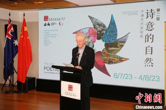 當(dāng)?shù)貢r(shí)間7月6日晚,第二屆“詩(shī)意的自然—中澳藝術(shù)家聯(lián)展”在悉尼開(kāi)幕。圖為澳大利亞水彩畫(huà)協(xié)會(huì)主席大衛(wèi)·范·紐恩在開(kāi)幕式上致辭。中新社記者 顧時(shí)宏 攝