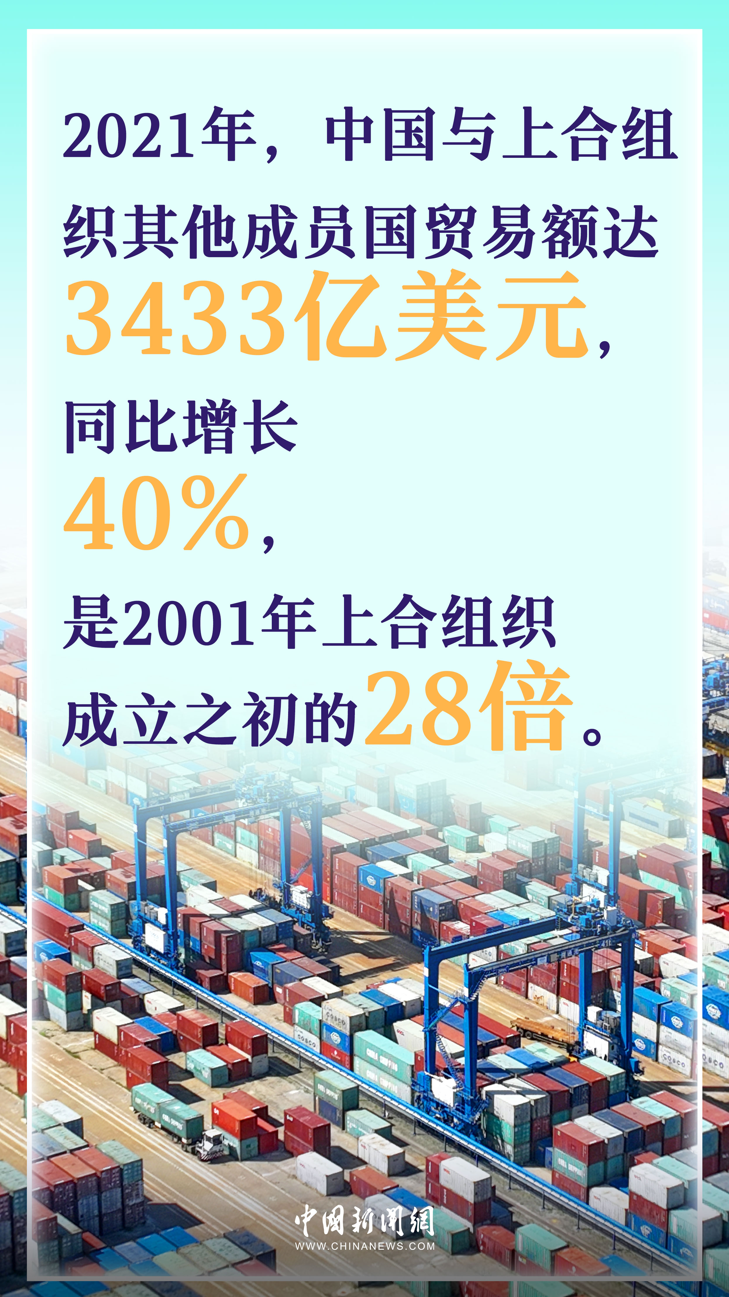 據(jù)統(tǒng)計,2021年,上合組織成員國國內(nèi)生產(chǎn)總值總和約為23.3萬億美元,占全球GDP近四分之一,比成立之初擴大了13倍多。其中,中國的作用也在日益凸顯,同年,中國與上合組織其他成員國貿(mào)易額達3433億美元,同比增長40%,是2001年上合組織成立之初的28倍。
