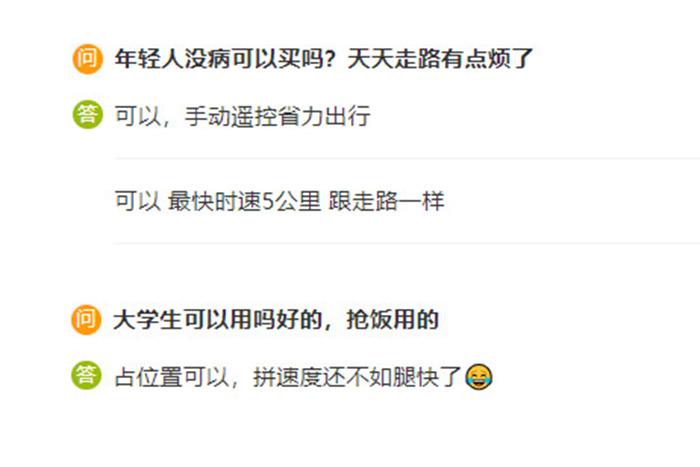 中新財(cái)經(jīng)注意到,在電商平臺(tái)上電動(dòng)輪椅的問答區(qū),不少消費(fèi)者都對(duì)電動(dòng)輪椅展現(xiàn)出了濃厚的興趣,“年輕人沒病可以買嗎?天天走路有點(diǎn)煩了。”“大學(xué)生可以用嗎?”“食堂搶飯用!神器?!薄澳贻p人也可以用,省力出行?!?/p>