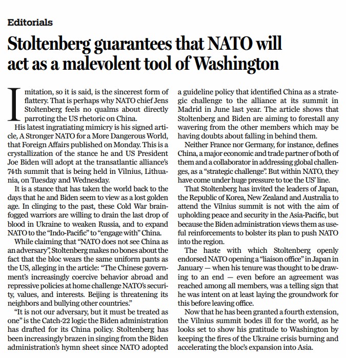 他最近的模仿是于7月10日在《外交事務(wù)》上發(fā)表題為《更強大的北約,應(yīng)對更危險的世界》的署名文章,字里行間透露了他和美國總統(tǒng)拜登在北約峰會上的立場。為了固守過去,這些頭腦昏昏的冷戰(zhàn)“斗士”寧愿讓烏克蘭流盡最后一滴血,以削弱俄羅斯,并將北約擴大到所謂“印太”地區(qū),遏制中國。