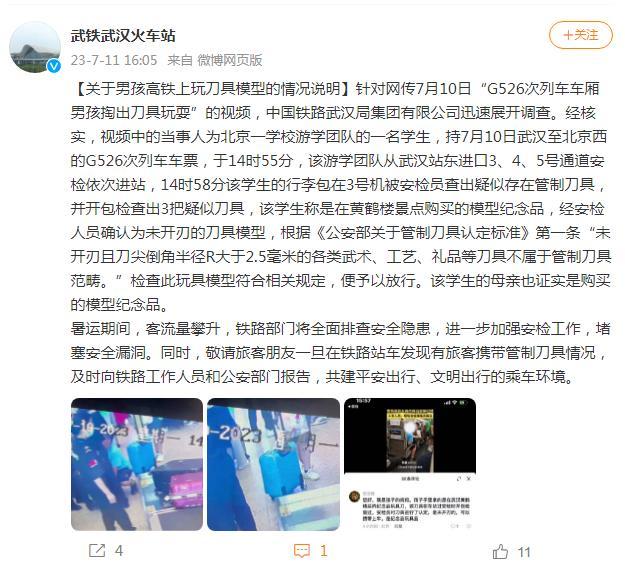 經(jīng)核實(shí),視頻中的當(dāng)事人為北京一學(xué)校游學(xué)團(tuán)隊(duì)的一名學(xué)生,持7月10日武漢至北京西的G526次列車車票,于14時(shí)55分,該游學(xué)團(tuán)隊(duì)從武漢站東進(jìn)口3、4、5號通道安檢依次進(jìn)站,14時(shí)58分該學(xué)生的行李包在3號機(jī)被安檢員查出疑似存在管制刀具,并開包檢查出3把疑似刀具,該學(xué)生稱是在黃鶴樓景點(diǎn)購買的模型紀(jì)念品,經(jīng)安檢人員確認(rèn)為未開刃的刀具模型,根據(jù)《公安部關(guān)于管制刀具認(rèn)定標(biāo)準(zhǔn)》第一條“未開刃且刀尖倒角半徑R大于2.5毫米的各類武術(shù)、工藝、禮品等刀具不屬于管制刀具范疇?!睓z查此玩具模型符合相關(guān)規(guī)定,便予以放行。該學(xué)生的母親也證實(shí)是購買的模型紀(jì)念品。