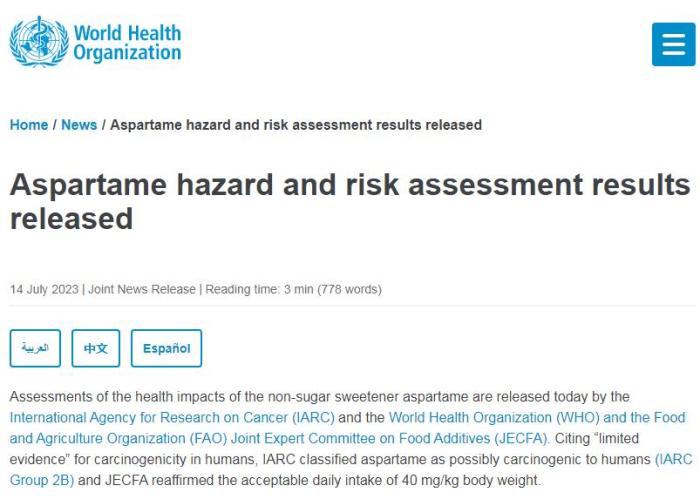 近期以來,“阿斯巴甜致癌”爭議引起廣泛關注。14日,世衛(wèi)組織官網(wǎng)上發(fā)布消息,國際癌癥研究機構(IARC)、世界衛(wèi)生組織和聯(lián)合國糧食及農(nóng)業(yè)組織(FAO)食品添加劑聯(lián)合專家委員會(JECFA)發(fā)布了阿斯巴甜對健康影響的評估結果。