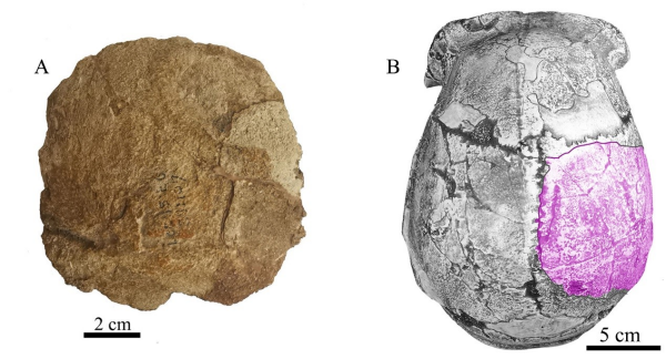 周口店第15號地點(diǎn)發(fā)現(xiàn)的人類頂骨化石。左側(cè):頂骨化石外側(cè)面觀;右側(cè):周口店直立人頭蓋骨模型頂面觀,示頂骨化石位置。圖片來源:中國科學(xué)院官網(wǎng)
