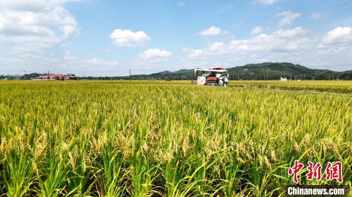 中新網(wǎng)福建長(zhǎng)汀7月17日電 (朱芳彬 丘偉華)眼下,位于福建省龍巖市長(zhǎng)汀縣河田鎮(zhèn)的遠(yuǎn)豐優(yōu)質(zhì)稻生產(chǎn)基地又迎來(lái)豐收,基地里的水稻陸續(xù)成熟進(jìn)入收割期,機(jī)械化按下開(kāi)鐮收割夏收“快進(jìn)鍵”。