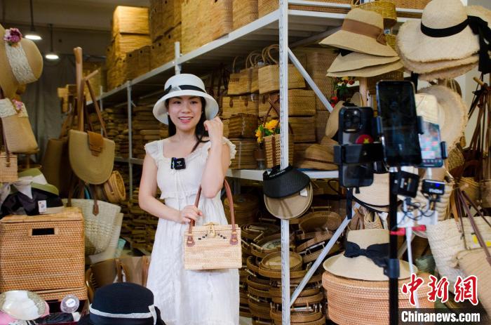 “這款純手工的東南亞藤編果盤,鑲有精美的貝殼,用來裝水果或點心,美觀實用?!弊哌M廣西防城港市下轄的東興市電商直播帶貨城,主播一邊對著手機直播帶貨,一邊展示手中商品,一旁貨架上擺滿紅木、藤編等各式工藝品和家居用品。
