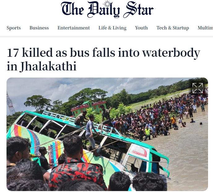 據(jù)報道,當?shù)貢r間22日上午約9:45分,在達卡以南約200公里的恰洛加蒂縣,一輛大巴掉入水中。當?shù)鼐椒Q,死者中包括至少8名婦女和3名兒童。