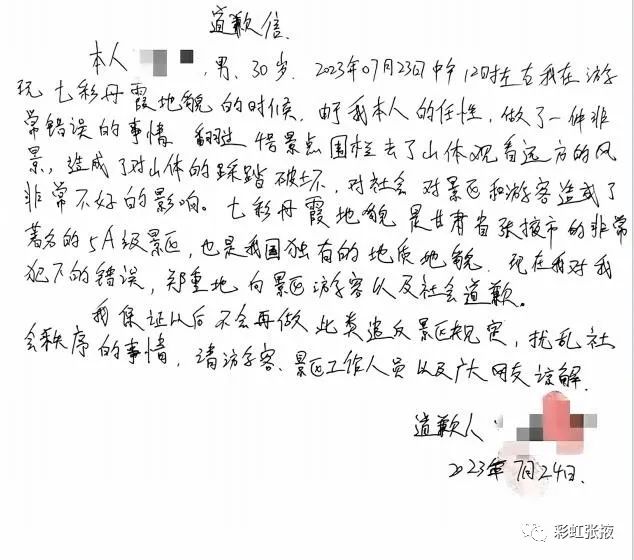 通報(bào)表示,該游客進(jìn)入?yún)^(qū)域是張掖世界地質(zhì)公園彩色丘陵保護(hù)范圍,雖然因其行走的山脊被黃土覆蓋,未造成實(shí)質(zhì)性損害,但其行為違反了《張掖七彩丹霞保護(hù)條例》和《治安管理處罰法》相關(guān)規(guī)定。7月24日16:50該游客從旅游途中返回臨澤縣,接受相關(guān)部門調(diào)查處理。市、縣林草部門對該游客進(jìn)行了嚴(yán)肅的批評教育;丹霞景區(qū)派出所依據(jù)《治安管理處罰法》對該游客處以200元罰款;該游客深刻認(rèn)識到自身行為的錯誤性和嚴(yán)重性,并公開致歉。