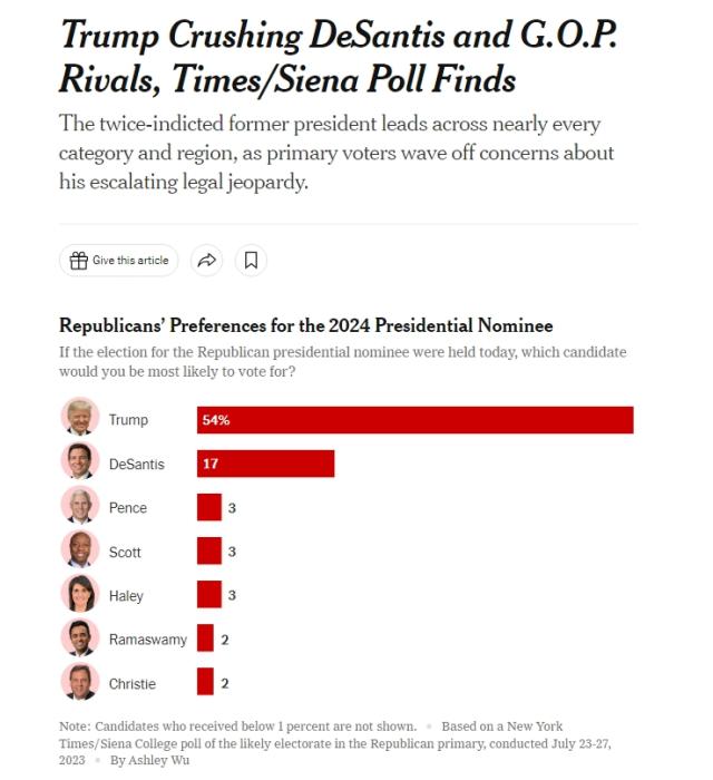中新網(wǎng)7月31日電 據(jù)《紐約時報》報道,《紐約時報》和錫耶納學院31日公布了一項針對共和黨選民的聯(lián)合民意調(diào)查結(jié)果:在所有的共和黨總統(tǒng)競選人中,特朗普以54%的支持率取得絕對領(lǐng)先地位,超出第二位德桑蒂斯37%,其余候選人支持率均未超過3%。
