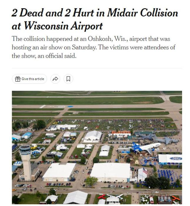 據(jù)《紐約時(shí)報(bào)》報(bào)道,美國聯(lián)邦航空管理局(FAA)稱,事故發(fā)生在威斯康星州奧什科什的惠特曼地區(qū)機(jī)場。在為期一周的活動(dòng)中,“實(shí)驗(yàn)飛機(jī)協(xié)會(huì)”在此舉辦飛行表演和航展。