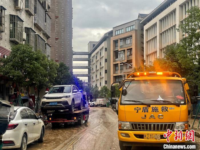 沿著中心街道往里走,越往里,積水退去后的殘留淤泥越多。街道兩側(cè),不時(shí)可看見(jiàn)堆放著不少被積水浸泡過(guò)后、無(wú)法使用的家具、生活用品以及貨物等,救援車將一部部受損車輛拖離現(xiàn)場(chǎng)。