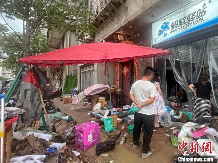 馮先生在蘭田村內(nèi)經(jīng)營(yíng)一家砂鍋米線店,積水退去,店內(nèi)人員正在清理器具,門(mén)口堆放著大量損失物品。呂巧琴 攝