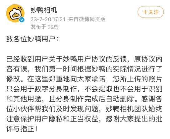 對此,妙鴨相機在7月20日回應(yīng)稱,原協(xié)議內(nèi)容有誤,并第一時間刪除了相關(guān)條款。