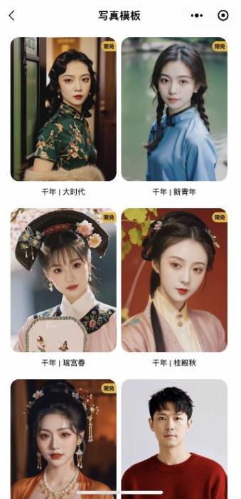 經(jīng)過一個下午的漫長等待,終于可以挑選自己喜愛的,堪比天真藍、海馬體照相館級別的質(zhì)感寫真了。從微信公眾號公開的33款模板來看,女性肖像模板豐富,有27款,包括清歡、奢感光、都市正裝等,男性模板僅6種,比如白衣、正裝、默片等。