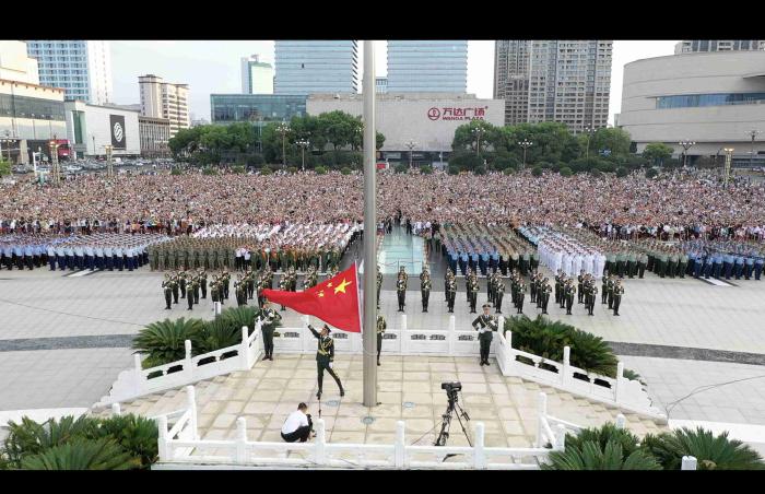 八月一號上午,全軍院?!皬娷姳毕盗斜荣惣薪涣髻?60余名官兵與南昌市相關代表集合在南昌八一廣場參加升旗儀式。 劉宇龍 攝