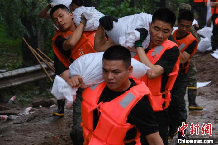 7月31日,永定河京原漫水橋附近發(fā)生漫溢,洶涌的洪水越過堤壩、漫上河岸。為保障沿岸居民安全,北京市門頭溝區(qū)水務(wù)局與區(qū)武裝部、區(qū)防汛抗旱指揮部實(shí)行統(tǒng)一協(xié)調(diào)調(diào)度,由武警北京總隊(duì)機(jī)動(dòng)第三支隊(duì)200名官兵對該處實(shí)施封堵作業(yè)。