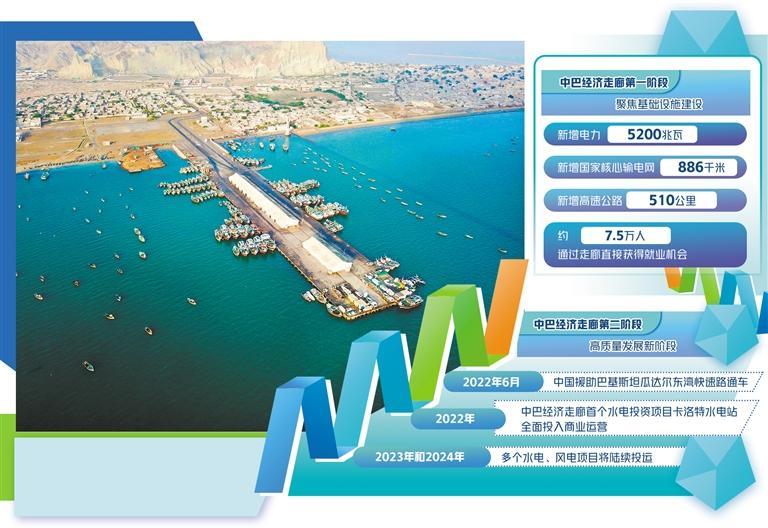 當前正處于中巴經(jīng)濟走廊建設(shè)的第二階段,這也是至關(guān)重要的高質(zhì)量發(fā)展新階段。中巴雙方在走廊框架下,進一步加強巴國工業(yè)化進程、人力資源培訓和產(chǎn)業(yè)園區(qū)建設(shè),在扶貧、醫(yī)療、農(nóng)業(yè)以及互聯(lián)網(wǎng)等眾多與民生息息相關(guān)的領(lǐng)域持續(xù)深化合作,力求創(chuàng)造更多就業(yè)機會,不斷推動巴基斯坦的經(jīng)濟和社會現(xiàn)代化發(fā)展,造福當?shù)孛癖姟?022年6月,中國援助巴基斯坦瓜達爾東灣快速路通車,打通了瓜達爾港和卡拉奇之間的交通運輸通道。同年,中巴經(jīng)濟走廊首個水電投資項目——卡洛特水電站全面投入商業(yè)運營,每年將向巴基斯坦提供32億千瓦時廉價清潔電能,滿足當?shù)?00萬人用電需求,每年可節(jié)約標準煤約140萬噸,減少二氧化碳排放350萬噸。今明兩年,走廊框架下的多個水電、風電項目將陸續(xù)投運,未來巴基斯坦在清潔能源領(lǐng)域大有可為。