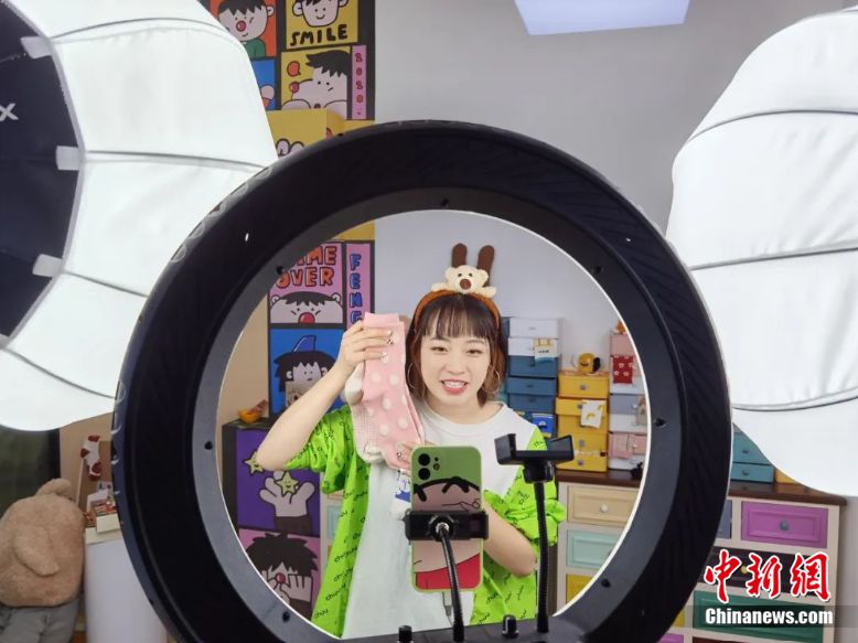 工作人員正在直播間銷(xiāo)售襪子。圖源:諸暨市大唐街道