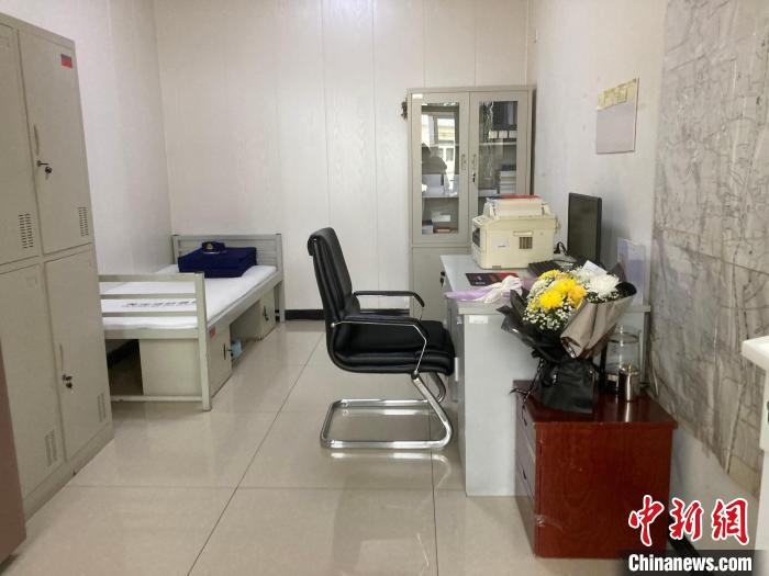 2023年8月,馮振在西小營(yíng)小型站工作和生活的站長(zhǎng)室,墻上貼著馮振和隊(duì)員一起繪制的地圖。 中新社記者 徐婧 攝