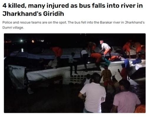據(jù)報道,當?shù)鼐椒Q,當晚約20:40,在賈坎德邦(Jharkhand)的吉里迪(Giridih)縣,一輛從蘭契開往吉里迪的大巴車突然撞壞大橋欄桿,隨后墜入河流,橋梁高度約15米,造成至少4人死亡。預(yù)計還有幾人溺水身亡,救援行動正在進行中。