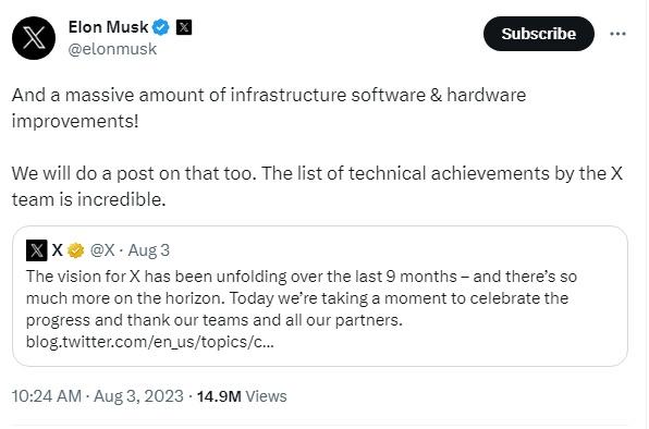 2023年4月,馬斯克將推特的法定名稱(chēng)更改為“X”。